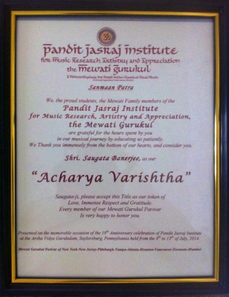 Guru Param Pujya Pandit Jasraj Ji in appreciation of sougata's musical skill proudly and affectionately bestowed him with the title of