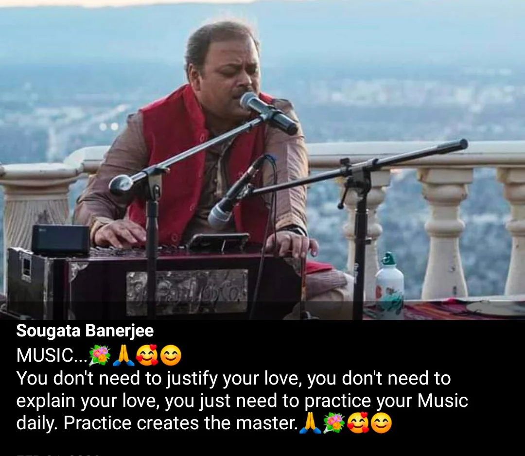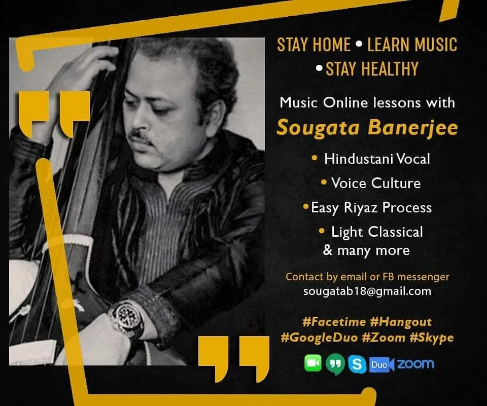 Sri Sougata Banerjee comes from a very renowned (Bishnupur Gharana) family of hindustani sangeet. Sougata's grandfather was Param Pujya Sangeetacharya Satya kinkar Bandyopadhyay Hindustani vocal maestro, the doyen of the Bishnupur Gharana. His father Param Pujya Pandit Nihar Ranjan Bandyopadhyay is a renowned hindustani musician.